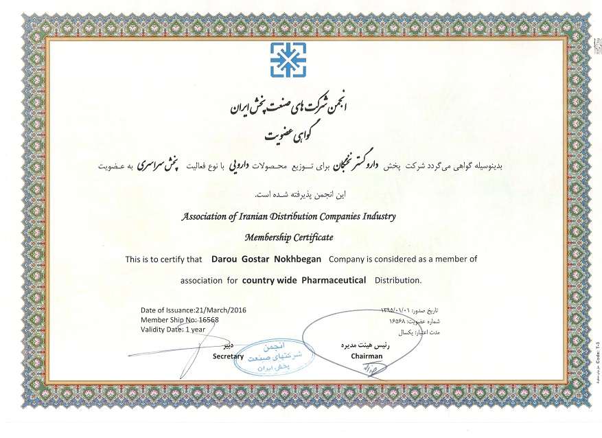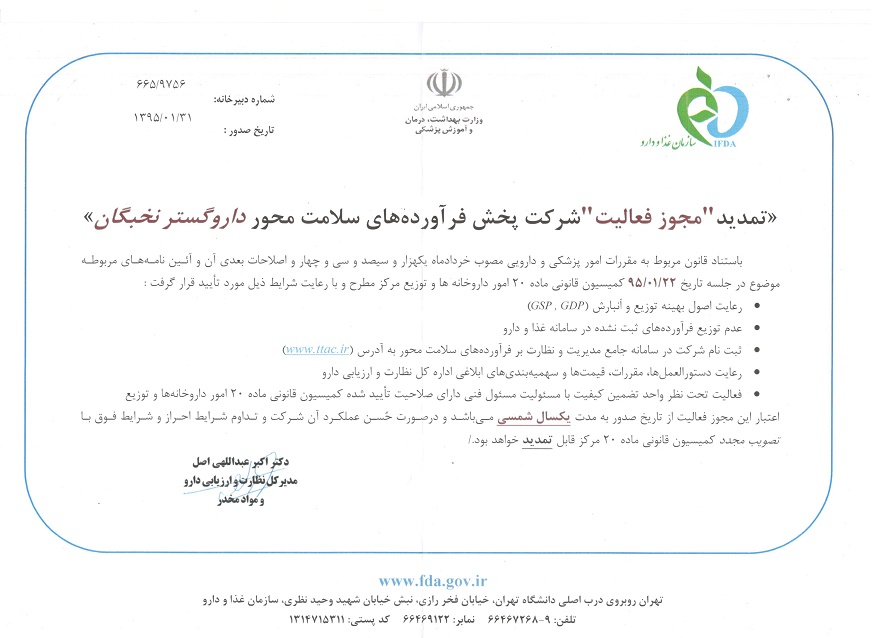 تمدید "مجوز فعالیت" شرکت پخش فرآورده های سلامت محور داروگستر نخبگان "آئین نامه تاسیس و فعالیت شرکتهای پخش فرآورده های سلامت محور"این آیین نامه به استناد قانون مربوط به مقررات امور پزشکی، دارویی و مواد خوردنی و آشامیدنی مصوب سال ۱۳۳۴ و اصلاح ها و الحاقهای بعدی آن و بندهای ۱۱ و ۱۲ و ۱۳ ماده یک قانون تشکیل و وظایف وزارت بهداشت، درمان و آموزش پزشکی مصوب سال ۱۳۶۷ تصویب میشود. | پیرو این گواهینامه شرکت پخش داروگستر نخبگان برای توزیع محصولات دارویی با نوع فعالیت پخش سراسری به عضویت این انجمن پذیرفته شده است. | |