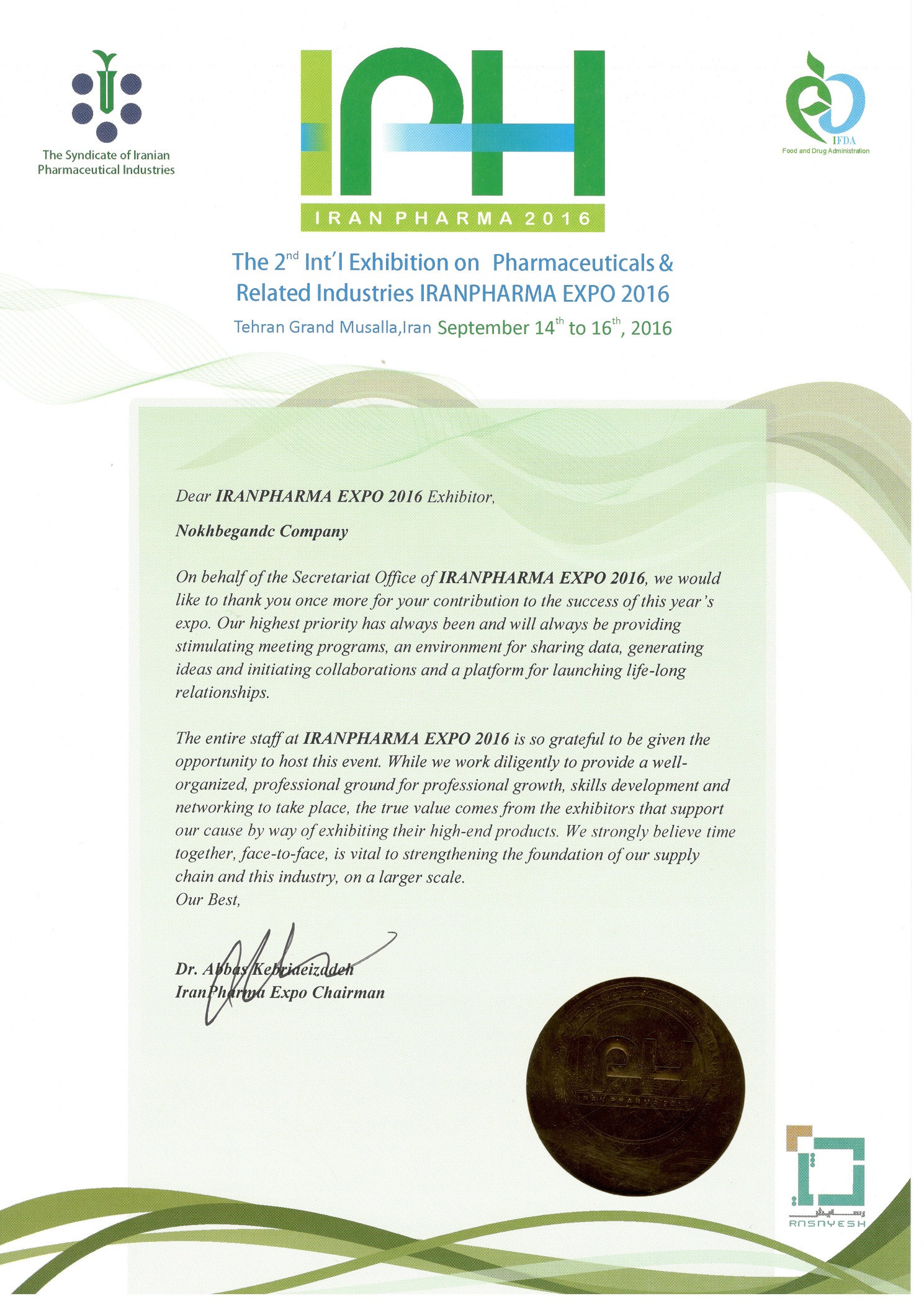 "اعطای لوح تقدیر از طرف جناب آقای دکتر کبریایی زاده به منظور حضور پررنگ در نمایشگاه بین المللی ایران فارما " دومین نمایشگاه بینالمللی دارو و صنایع وابسته و تجهیزات مراقبتی به عنوان یکی از بزرگترین رویدادهای صنعت داروسازی با حضور جمع كثيري از شركتهاي توانمند داخلي و خارجي در زمينه تولید دارو، تولید مواد اولیه و مواد موثره، مکملهای غذایی و دارویی، فرآوردههای گیاهی و طبیعی، فرآوردههای آرایشی و بهداشتی، تجهیزات مراقبتی، تجهیزات داروسازی، چاپ و بستهبندی و خدمات قراردادی توسط سندیکای صاحبان صنایع داروهای انسانی ایران برگزار شد. |