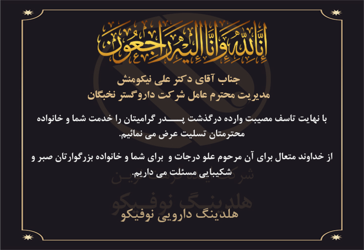 با نهایت تاسف مصیبت وارده درگذشت پـــدر گرامیتان را خدمت شما و خانوادهمحترمتان تسلیت عرض می نمائیم. از خداوند متعال برای آن مرحوم علو درجات و برای شما و خانواده بزرگوارتان صبر و شکیبایی مسئلت می داریم.